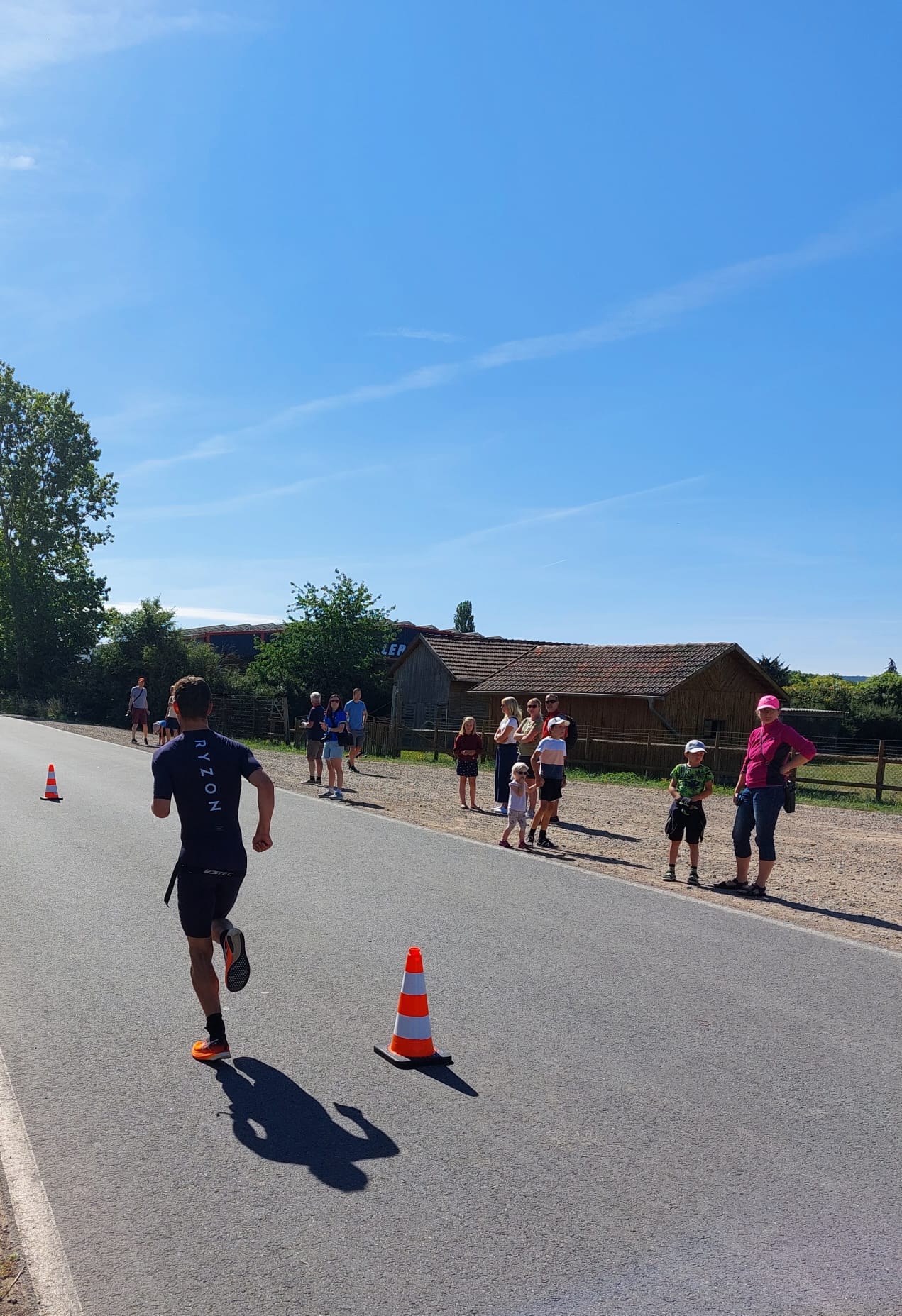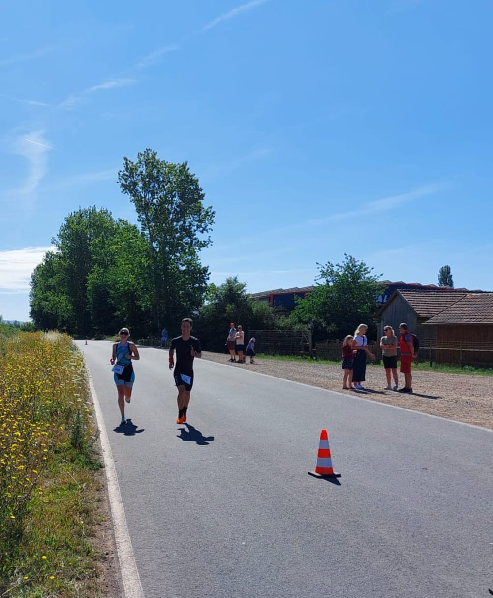 Der Wechsel auf das Rad verlief optimal und so konnte ich auf der Radstrecke zwei Positionen gut machen und abzählen, dass ich mich zum Ende des Radfahrens an Position 7 befand. Lisa konnte sich indes auf den dritten Rang vorkämpfen und ich freute mich, dass wir uns jedes Mal gegenseitig anfeuern konnten, wenn wir uns entgegenkamen. Nach dem Wechsel zum Lauf gab Lisa alles, um Position drei zu halten und belohnte sich mit einer starken Laufleistung im 5min/km Schnitt. Für mich ging mit dem Wechsel die Aufholjagd weiter. Die Plätze 5 und 6 konnte ich dabei relativ schnell ein und überholen, doch als mir die Spitze vom Wendepunkt entgegen kam, wurde ich etwas entmutigt. Der Abstand zum Podium war leider schon zu groß. Trotzdem hatte ich endlich mal einen soliden Lauf ohne Beschwerden und brachte einen Schnitt von 3:43min/km auf den Plattenweg. Insgesamt bedeutet das für mich Platz 5 und den Altersklassensieg in einer Endzeit von 1:08:55h. Wenig später konnte ich Lisa noch anfeuern, die ihren Vorsprung vor Platz 4 komfortabel ausgebaut hat und nun nach 1:22:11h das Ziel erreichte. Nun bin optimistisch gestimmt, dass es am nächsten Wochenende in Leipzig ähnlich verlaufen wird und die Beine vielleicht sogar etwas mehr hergeben, wenn ich anständig getapert habe.